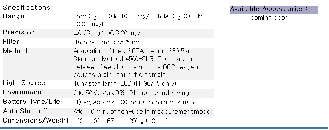 HANNAÀÇ »õ·Î¿î ½Ì±ÛÇ׸ñ ºñ»ö°è Á¦Ç°¿¡´Â ¾Ï¸ð´Ï¾Æ, ¸î¸î ÃøÁ¤¹üÀ§¿¡¼ ¿°¼Ò, ±¸¸®, anionic detergents, fluoride, iron, nitrite, phosphate¿Í phosphorus¸¦ ÃøÁ¤ÇÏ´Â ±â°è°¡ µé¾î°£´Ù. ÀÌ ½Ã¸®Áî´Â ³ÐÀº ÀÌÁß LCD, Áøº¸µÈ ±¤ÇÐ ½Ã½ºÅÛ ±×¸®°í CAL CHECK È®ÀÎ ±â´ÉÀÌ ÀÖ½À´Ï´Ù. ÀÌ Áøº¸µÈ ±¤ÇÐ ½Ã½ºÅÛÀº ¸Å½Ã°£ Á¤È®ÇÑ ±â·ÏÀ» º¸ÀåÇÏ´Â ÅÖ½ºÅÙ ·¥ÇÁ(model HI 96715 ´Â LED±â´ÉÀÌ ÀÖÀ½)¿Í ¹æÇØ ÇÊÅÍ·Î ±¸¼ºµÇ¾îÀÖ½À´Ï´Ù. CAL CHECKÈ®ÀÎ ±â´ÉÀº ¾ðÁ¦¶óµµ ±â°èÀÇ ¼öÇ൵¸¦ È®ÀÎÇÒ ¼öÀÖ´Â ±â´ÉÀÔ´Ï´Ù. °£´ÜÇÑ ¹æ½ÄÀ¸·Î ±â°è°¡ º¸Á¤µÇ¾ú´ÂÁö È®ÀÎÇØ º¼ ¼ö ÀÖ½À´Ï´Ù. ±â°èÀÇ ½ÇÇ൵¸¦ È®ÀÎÇϱâ À§ÇØ ÇѳªÀÇ ¸ÂÃã½ÄÀÇ NIST ÃßÀû °¡´É Ç¥ÁØÀ» »ç¿ëÇϰí ÇÊ¿äÇϸé À纸Á¤ÇÕ´Ï´Ù. ¸ðµç ±â°è´Â °øÀå¿¡¼ º¸Á¤µÇ°í electronic°ú optical µðÀÚÀÎÀº ÀÚÁÖº¸Á¤ÇؾßÇÒ Çʿ伺À» ÁÙ¿©ÁÝ´Ï´Ù. ¾ß¿ÜÃøÁ¤¿¡ ÀÌ»óÀûÀÎ ÀÌ ±â±â´Â ¹æ¼öŸÀÔÀÌ¸ç ½Ã½ºÅÛÀ» ÃøÁ¤ÇÏ´Â ·¥ÇÁ¿Í ÇÊÅÍ´Â ¸ÕÁö¿Í ´õ·¯¿î ¹°Áú·Î ºÎÅÍ º¸È£Çϵµ·Ï ¿î¼ÛĸÀÌ ÀÖ½À´Ï´Ù. ¾×Á¤ÄÚµå´Â ÀÛµ¿À» µ½°í ³·Àº ¹èÅ͸® °æ°í±â´Éµµ µé¾îÀÖ½À´Ï´Ù. ÀÚµ¿²¨Áü ±â´ÉÀº 10ºÐµ¿¾È »ç¿ëÀÌ ¾øÀ¸¸é ±â°è°¡ ²¨Áö´Â ±â´ÉÀÔ´Ï´Ù. Å¥ºªÀº ÃÖ»óÀÇ °á°ú¸¦ ¾ò±âÀ§ÇÏ¿© Ưº°È÷ ±¤ÇÐÀ¯¸®·Î ¸¸µé¾îÁ³°í positivelocking ½Ã½ºÅÛÀº Å¥ºªÀÌ ÃøÁ¤¼¿ÀÇ ¸Å °°Àº À§Ä¡¿¡ ³õÀ̵µ·Ï º¸ÀåÇØÁÝ´Ï´Ù. ¼¿Àº »ùÇðú ½Ã¾àÀ» Ãß°¡ÇÒ¶§ ½±µµ·Ï ÀÔ±¸°¡ ³Ð°Ô µðÀÚÀÎ µÇ¾ú½À´Ï´Ù. ½Ã¾àÀº °¡·çÇüÅÂÀÌ¸ç ¹À½À¸·Î °ø±ÞµË´Ï´Ù. ½Ã¾àÀÇ ¾çÀº ÀçÇö¼ºÀÇ ÃÖ´ëȸ¦ º¸ÀåÇϵµ·Ï Á¤È®ÇÏ°Ô Åõ¿©µË´Ï´Ù.