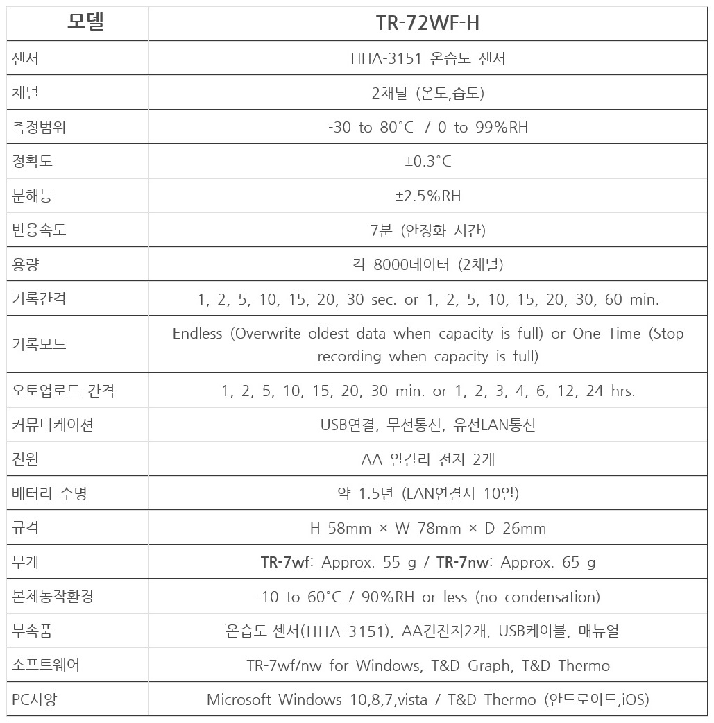 TR-72WF-H ¸ðµ¨Àº2ä³Î °íÁ¤¹Ð ¹«¼± ¿Âµµ,½Àµµ µ¥ÀÌÅͷΰŷνá, ¿Â½Àµµ µ¥ÀÌÅ͸¦ ¹«¼±LAN (TR-72NW-H ¸ðµ¨Àº À¯¼± LAN), ¾ÛÀ»ÅëÇÑ ¸ð¹ÙÀÏ Á¢¼Ó, USB¿¬°á µîÀÇ ±â´ÉÀ» ÅëÇØ ¿Âµµ¸¦ ±â·Ï, ÀúÀå ÇÒ ¼ö ÀÖ½À´Ï´Ù.