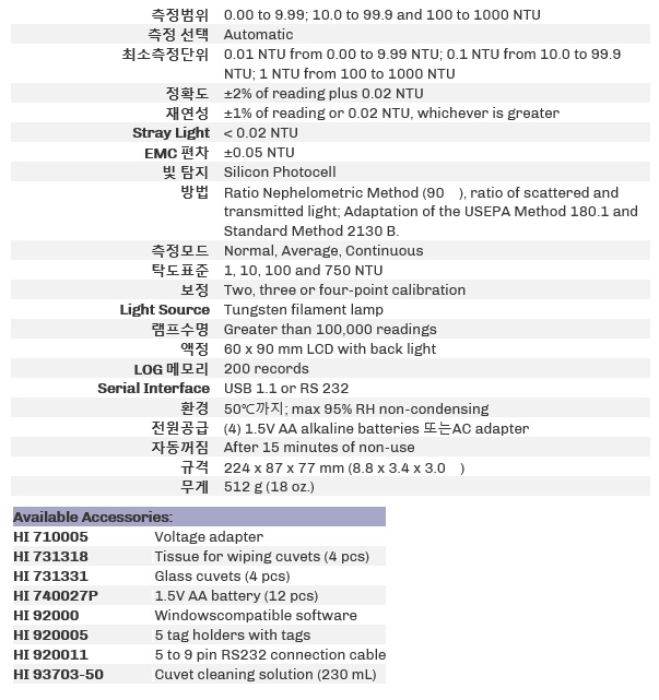 HI 98703Àº EPA compliant tungsten light source¸¦ ÀÌ¿ëÇϰí Á¤È®ÇÏ°í ½Å·ÚÇÒ ¸¸ÇÑŹµµ¸¦ ÃøÁ¤ÇÏ´Â ÃÖ÷´Ü ±¤½Ã½ºÅÛÀÔ´Ï´Ù. ÀÌ ±â±â´Â ³·Àº ʵµ¿¡¼ ƯÈ÷ Á¤È®ÇÕ´Ï´Ù. ʵµ´Â 1000NTU±îÁöÃøÁ¤ÇÒ ¼ö ÀÖ½À´Ï´Ù. EPA ±â·Ï ¿ä±¸¿¡ ÀÀÇϱâ À§ÇØ ÀÌ ±â°è´Â EPA compliance ±â·Ï¸ðµå¸¦ °¡Áö°í ÀÖ½À´Ï´Ù. ÃøÁ¤ÇÒ »ùÇðú Á¤È®µµ¿¡ µû¶ó »ç¿ëÀÚ´Â ÀϹÝÃøÁ¤, ¿¬¼ÓÃøÁ¤ ¶Ç´Â ½ÅÈ£Æò±ÕÄ¡µîÀ» ¼±ÅÃÇÒ ¼ö ÀÖ½À´Ï´Ù.